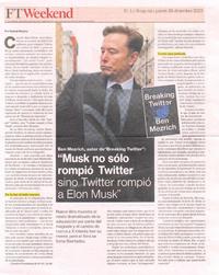 "Musk no sólo rompió Twitter sino Twitter rompióa Elon Musk" [artículo] Por Hannah Murphy.