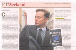 "Musk no sólo rompió Twitter sino Twitter rompióa Elon Musk" [artículo] / Por Hannah Murphy. La Tercera (Diario : Santiago, Chile)-- Diciembre 28, 2023, página 13. 1 página : ilustraciones en color ; 36 cm. .
