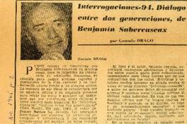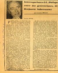 Interrogaciones-94. Diálogo entre dos generaciones, de Benjamín Subercaseaux [artículo] / Por Gonzalo Drago. El Siglo (Diario : Santiago, Chile)-- Diciembre 5, 1965, página 2. 1 página : ilustración en blanco y negro ; 20 cm. .