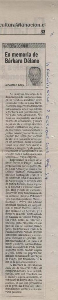 En memoria de Bárbara Délano [artículo] / Sebastián Gray. La Nación (Diario : Santiago, Chile) Octubre 2, 2006, página 33. 1 página : ilustración en blanco y negro ; 29 cm. .