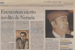 Encuentran escrito inédito de Neruda [artículo]. La Hora (Diario : Santiago, Chile)-- Mayo 18, 2007, página 18. 1 página : ilustraciones en color ; 16 cm. .