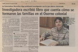 Investigadora escribió libro que cuenta cómo se formaron las familias en el Osorno colonial [artículo] / Pamela Vergara Moraga. El Austral (Diario : Osorno, Chile)-- Marzo 25, 2007, página A-13. 1 página : ilustración en color ; 26 cm. .