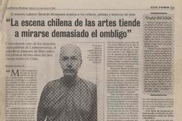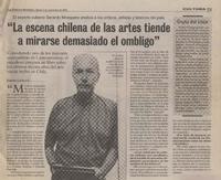 "La escena chilena de las artes tiende a mirarse demasiado el ombligo" [artículo] / Rodrigo Castillo R. Las Últimas Noticias (Diario : Santiago, Chile)-- Septiembre 21, 2006, página 35. 1 página : ilustración en blanco y negro ; 22 cm. .