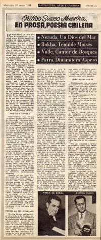 Crítico sueco muestra en prosa, poesía chilena [artículo]. Ercilla (Revista : Santiago, Chile) Número 1182 (15 de Enero de 1958) páginas 12-13. 2 páginas : ilustraciones en blanco y negro ; 36 cm. .