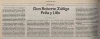 Don Roberto Zúñiga Peña y Lillo [artículo] / Por Luis Sánchez Latorre. Las Últimas Noticias (Diario : Santiago, Chile)-- febrero 11, 1995, página 16. 1 página ; 15 cm. .
