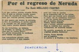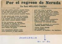Por el regreso de Neruda / Democracia 10 de noviembre de 1952 -- Neruda viaja enfermo / Democracia 30 de julio de 1952 -- Por Raúl Mellado Castro -- Pablo Neruda abandono Ginebra el 24 / Democracia 27 de julio de 1952 -- Jubilo en Brasil, el regreso de Neruda / 14 de agosto de 1952 -- El pueblo lo recibira a las 12 en la plaza Argentina / Democracia 26 de julio de 1952 -- El mal tiempo retrasó viaje de Pablo Neruda llegará hoy / La Unión 27 de julio de 1952 -- Pablo Neruda llega hoy / Inponente recepción se tributará a Neruda / Democracia Santiago 25 de julio de 1952 -- Pablo Neruda / Democrácia 25 de julio de 1952 -- Por Juan Camilo Rojas Cáceres -- La clase obrera tiene el deber de tomar en sus manos la defensa y seguridad de Pablo Neruda / Democracia julio 25 de 1952 -- Con motivo del próximo regreso de Pablo Neruda a su patria, comité juvenil de partidarios de la paz hace allamamiento a la juventud / Democracia julio 25 de 1952 -- Faltan pocas horas para la llegada de Neruda / A esperar a Pablo Neruda llama, el Frente del pueblo / Democracia 24 de julio de 1952 -- Inquietud despierta, la demora de la llegada del poeta Pablo Neruda / Democracia julio 28 de julio de 1952 -- Debe continuar lucha, en favor de Neruda / Democracia 24 e julio de 1952 -- El regreso de Pablo Neruda, da un nuevo inpulso a la lucha por la paz / Democracia 24 e julio de 1952 --