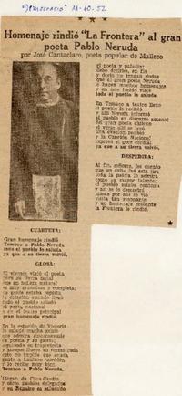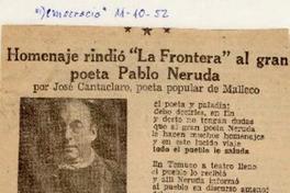Homenaje rindió "La Frontera" al gran poeta Pablo Neruda / Democracia 11 de octubre de 1952 -- Por José Cantaclaro (poeta popular de Malleco) -- Una enorme concurrencia asistió / Democracia 19 de octubre de 1952 -- La gota de veneno / Democracia 4 de junio de 1952 -- Las palabras de ayer de Neruda / Democracia 1 de septiembre de 1952 -- "Esta es una nueva etapa que comienza: debemos transformar nuestra Patria" / Democracia 6 de octubre de 1952 -- Pablo Neruda -- La dilatada guerra / Democracia 18 de octubre de 1952 -- Por Pablo Neruda -- B. O´Higgins Riquelme (1810) / Democracia 18 de octubre de 1952 -- Por Pablo Neruda -- América Insurrecta (1800) / Democracia 18 de septiembre de 1952 -- Por Pablo Neruda -- Manuel Rodríguez (Cueca) / Por Pablo Neruda -- Toqui Caupolicán / Por Pablo Neruda -- Un acto de unidad y de lucha por la paz y la libertad fué el homenaje a Pablo Neruda en Valparaíso / Una importante entrevista sostuvo ayer Pablo Neruda / Democracia 2 de octubre de 1952 -- Chilenos en el Festival de Berlín / Democracia 27 de octubre de 1952 -- Por Fernando Ortíz -- Hoy habla Neruda en el Caupolicán / Democracia 31 agosto de 1952 -- ¡Hacia Berlín! / Democracia 29 de agosto de 1952 -- Por Pablo Neruda -- Valparaíso rinde hoy homenaje a Pablo Neruda / Democracia 29 de agosto de 1952 -- Sindicatos adhieren en masa al homenaje a Pablo Neruda / Democracia 28 de agosto de 1952 -- En El Caupolicán rinde homenaje a Neruda el 31 / Democracia 26 de agosto de 1952 -- Pablo Neruda en Valparaíso / Democracia 13 de septiembre de 1952 -- Por Edmundo Lazo -- Mañana Pablo Neruda / Democracia 25 de agosto de 1952 -- Valparaíso recibe a Pablo Neruda el jueves próximo / Democracia 23 de agosto de 1952 -- "La mano amiga que tu mano cierra es la de tus hermanos argentinos" / Democracia 18 de agosto de 1952 -- Por Leonidas Barletta --