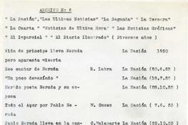 "El Imparcial" / Pablo Neruda sería candidato a senador por Santiago, apoyado en las fuerzas radicales y falangista / Pablo Neruda no será detenido; llegará esta tarde prrocedente de Montevideo / El caso Neruda / Durante la trilla / Pablo Neruda -- Pablo Neruda / Las Noticias Gráficas / Hoy llega Pablo Neruda a los Cerrillos: grandioso recibimiento espera el poeta / Neruda, victima de la democracia radical llega hoy a Cerrillos / El mal tiempo evito la llegada de Neruda: hoy cruzara Los Andes / Neruda viene volando: llega este mes / Contra viento y marea, Pablo Neruda regresará a Chile a fines de este mes / Neruda envió la mejor corona para don Arturo: Desde París / Carlos Vial Espantoso y Guillermo del Pedregal probables sucesores de Neruda / La Tercera de la hora,La Cuarta y Las últimas Noticias / Neruda, 65 años / Omniteatro lírico / "Ser y morir en Pablo Neruda / Plenitud creadora / Por Sergio Latorre V. -- Pablo Neruda / Inesperados ataques al poeta Neruda /