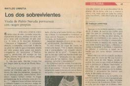 Los dos sobrevivientes / Por Guillermo Blanco -- Pasión, ternura, sinceridad / Mauricio de la Parra, "Neruda está inserto en nuestras vidas / Bernardita de la Parra -- Crítica teatral Skármeta: "Ardiente paciencia" / Sergio Palacios -- La "Ardiente paciencia" de Neruda y Skámeta / Jacquelines Mouesca -- Carlos Orellana -- Torrentes de emotividad / Luis Poirot: para resucitar a Neruda / Encuentro con Pablo Neruda / Por Yuri Dashkevich -- Pablo Neruda a los 65 años / Por Luis Alberto Mansilla -- Julio 12 de 1904 nació en Parral, Pablo Neruda (La Barcarola) / D. D. -- Pór aquellos días / Por Luis E. Délano -- Hace 40 años los poetas jóvenes escribían y se vestían a "lo Neruda" / Por Mortimer Gray -- Los libros / Por Edmundo Palacios -- Neruda: Señores Obispos, cuidado con las enciclopedias "La caridad no hara los acambios" / Pablo Neruda -- "Cantos ceremoniales" / Traductores millonarios / Neruda festejado en 1927 / Chile 7 días corazón de la cultura mundial (El cincuentenario de Neruda) / Neruda 50 años de vida, lucha y poesía / El 5 conferencias, Neruda se confeso con Chile / Por Joaquín Aurelio Guzmán -- Coferencias de Neruda: Un viaje por las letras chilenas durante 30 años / Actos del Caupolican "Premio Stalin a Neruda" / Baltasar Castro --