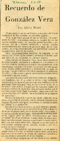 Recuerdos de González Vera / Por Alicia Morel -- Federico Gana: Manchas de color / Por Hernán del Solar -- Escritores de Valdivia / Por David Ojeda Leveque -- José Santos González Vera / La crónica de Federico Gana / Por Alone -- Obras escogidas de Manuel Rojas / González Vera / Por Elena Caffarena de Jiles -- Cabeza esculpida en piedra del escritor José S. González Vera / José Santos González Vera de las "Vidas Mínimas" / Jorge Marchant -- Permanencia de González Vera 1957 / Por Rodrigo Garces Guzmán -- Homenaje a González Vera / Por M. C. G. -- El otro González Vera / 6 cuentos de escritores yugoslavos / Por Hernán del Solar -- El buen decir / C. -- Alone: cátedra y crítica / Fernando Durán V. -- José Santos González Vera / Por M. C. G. -- El estilo de González Vera / Hernán del Solar -- José Santos González Vera (1950) / Gastón Colina -- Leer y releer / Por Ernesto Montenegro --