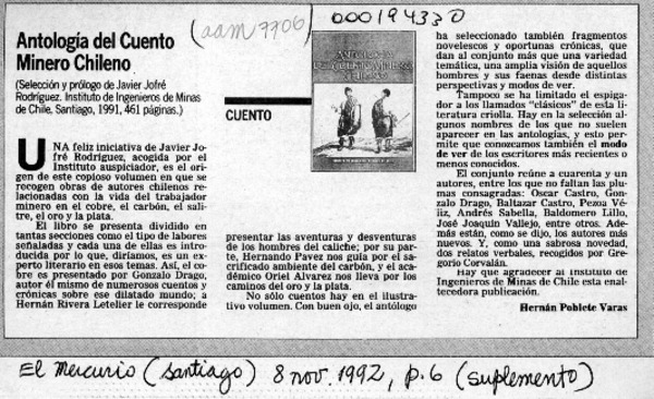 Antología del cuento minero chileno [artículo] Hernán Poblete Varas.