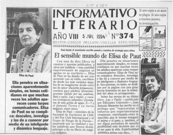 Escritora Elisa de Paut destaca renovación artística [artículo].