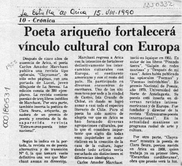 Poeta ariqueño fortalecerá vínculo cultural con Europa [artículo].