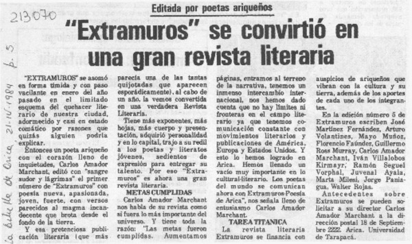 "Extramuros" se convirtió en una gran revista literaria [artículo].