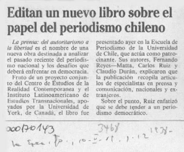 Editan un nuevo libro sobre el papel del periodismo chileno [artículo].