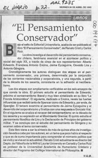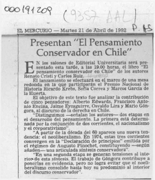 Presentan "El Pensamiento Conservador en Chile" [artículo].