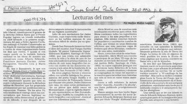 Lecturas del mes [artículo] Marino Muñoz Lagos.