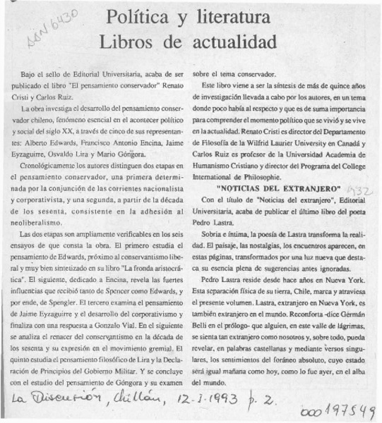 LASTRA, PEDRO - CRISTI, RENATO - RUIZ, CARLOS - PENSAMIENTO CONSERVADOR - NOTICAS DEL EXTRANJERO
