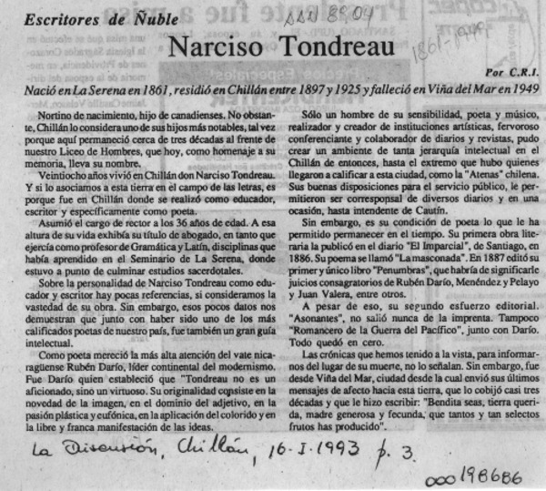 Narciso Tondreau [artículo] C. R. I.