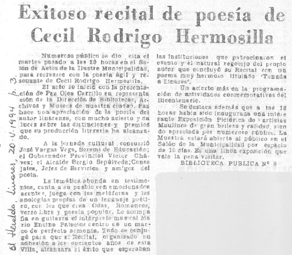 Exitoso recital de poesía de Cecil Rodrigo Hermosilla [artículo].