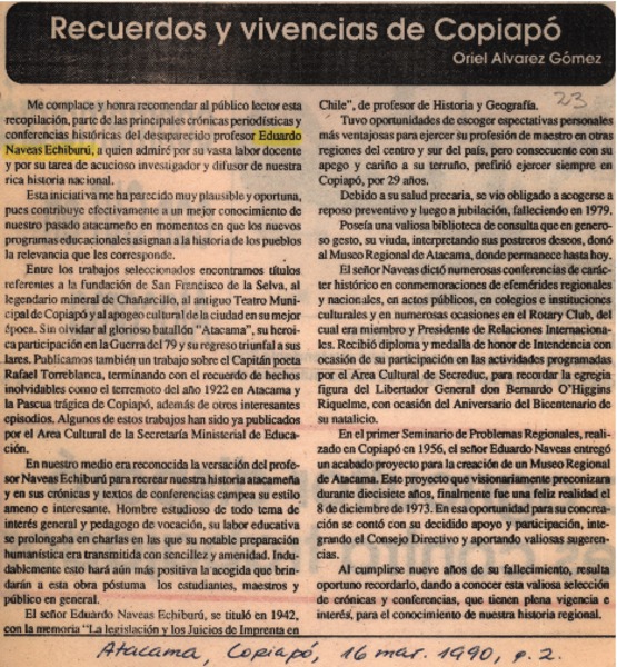 Recuerdos y vivencias de Copiapó [artículo] Oriel Alvarez Gómez.