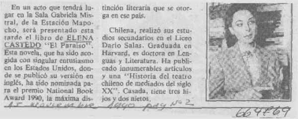 Elena Castedo presentará su "Paraíso" [artículo] Alejandra Gajardo.