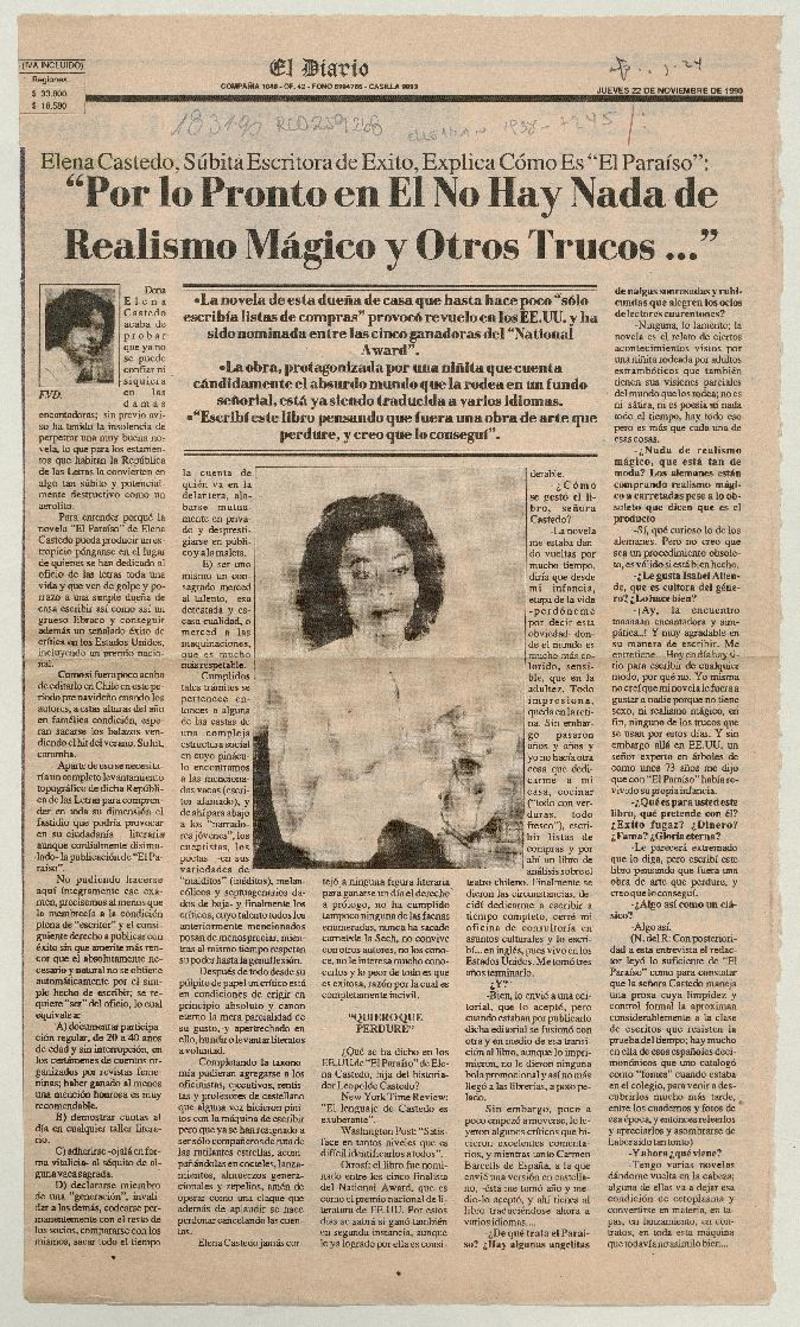 "Por lo pronto en él no hay nada de realismo mágico y otros trucos -- " [artículo] F. V. D.