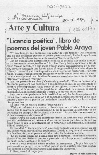 "Licencia poética", libro de poemas del joven Pablo Araya [artículo] Mario Tomás Schilling.
