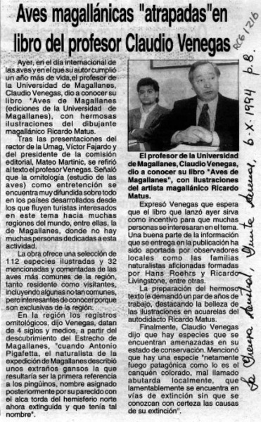 Aves magallánicas "atrapadas" en libro del profesor Claudio Venegas [artículo].