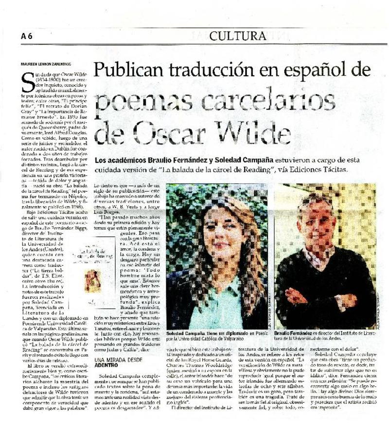 Publican traducción en español de poemas carcelarios de Oscar Wilde [artículo] Maureen Lennon Zaninovic.