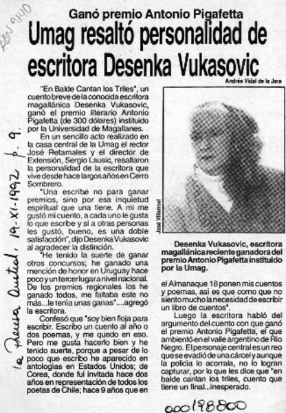 Escritora Desenka Vukasović ganó concurso literario [artículo].