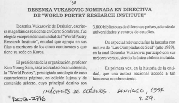 Desenka Vukasovic nominada en directiva de "World poetry research institute" [artículo].