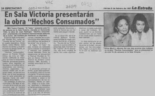 En sala Victoria presentarán la obra "Hechos consumados" [artículo].