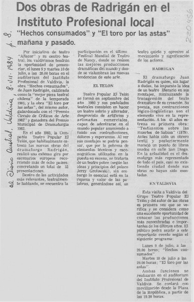 Dos obras de Radrigán en el Instituto Profesional local [artículo].