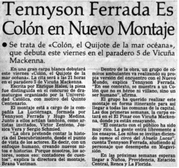 Tennyson Ferrada es Colón en nuevo montaje [artículo].