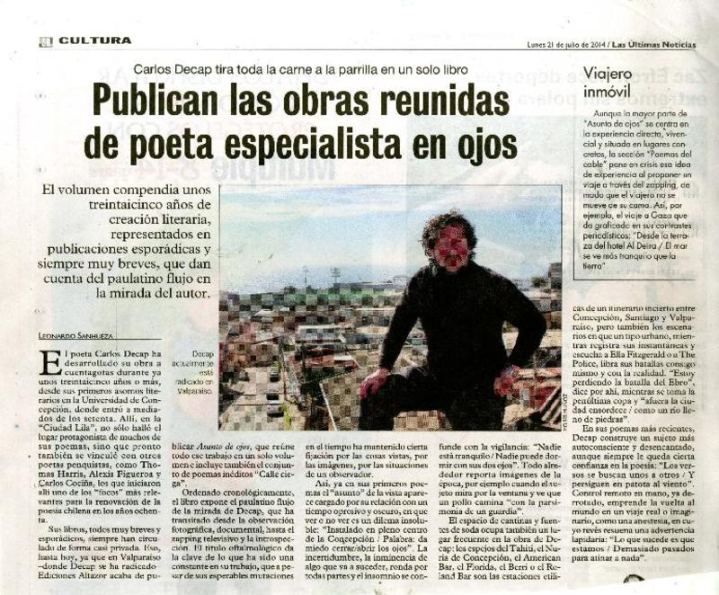 Publican las obras reunidas de poeta especialista en ojos [artículo] Leonardo Sanhueza