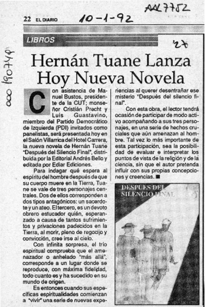 Hernán Tuane lanza hoy nueva novela [artículo]