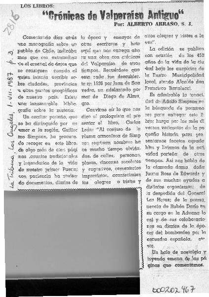 "Crónicas de Valparaíso antiguo" [artículo] Alberto Arraño.