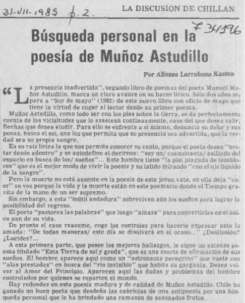 Búsqueda personal en la poesía de Muñoz Astudillo [artículo] Alfonso Larrahona Kästen.