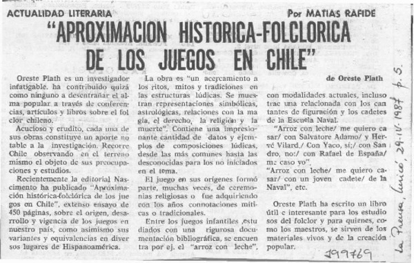 "Aproximación histórica-folklórica de los juegos en Chile" [artículo] Matías Rafide.