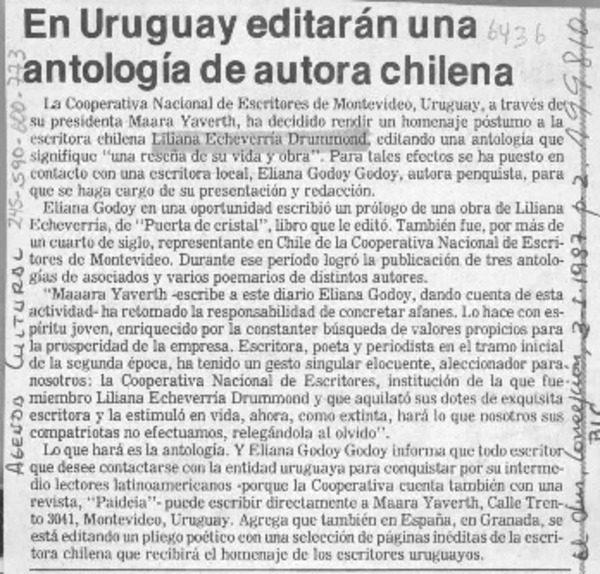 ![En Uruguay editarán una antología de autora chilena [artículo]. En Uruguay editarán una antología de autora chilena [artículo].](channels-528_mime_jpg.gif)