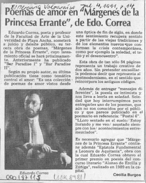 Poemas de amor en "Márgenes de la princesa errante", de Edo. Correa [artículo] Cecilia Burgos.