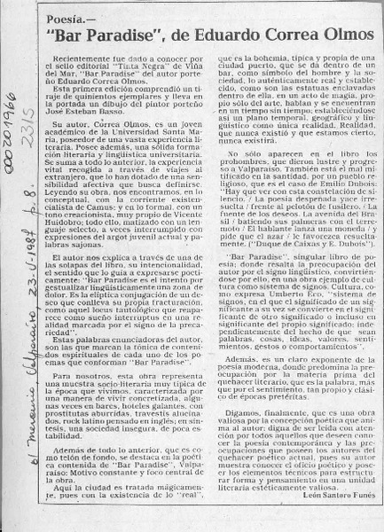 "Bar Paradise", de Eduardo Correa Olmos [artículo] León Santoro Funes.