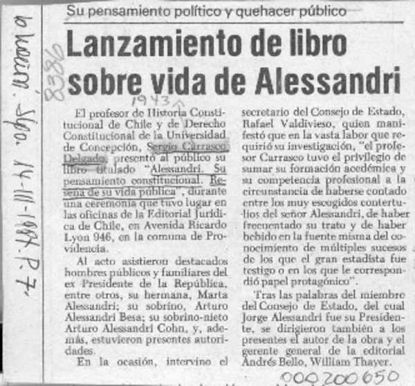 Lanzamiento de libro sobre vida de Alessandri [artículo].