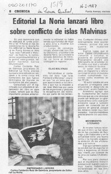 Editorial La Noria lanzará libro sobre conflicto de islas Malvinas [artículo].