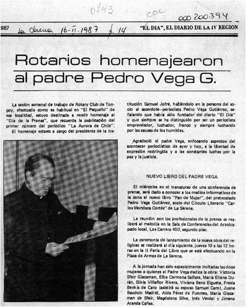 Rotarios homenajearon al padre Pedro Vega G. [artículo].