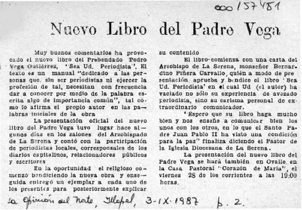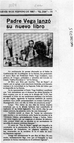 "Pan de mujer", libro del padre Pedro Vega [artículo].