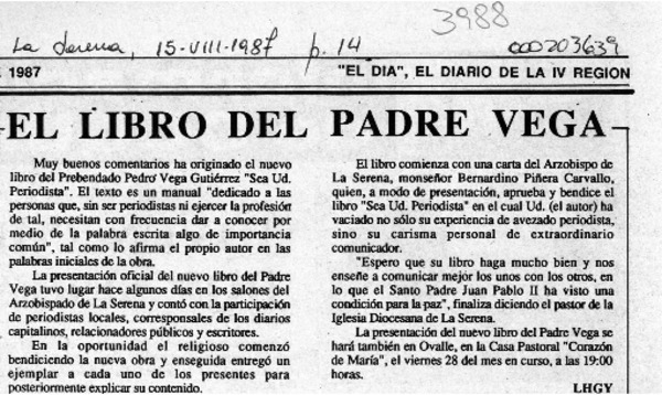 Ceremonia lanzamiento nuevo libro Padre Vega [artículo].