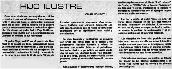 Padre Pedro Vega fue declarado hijo ilustre. [artículo]