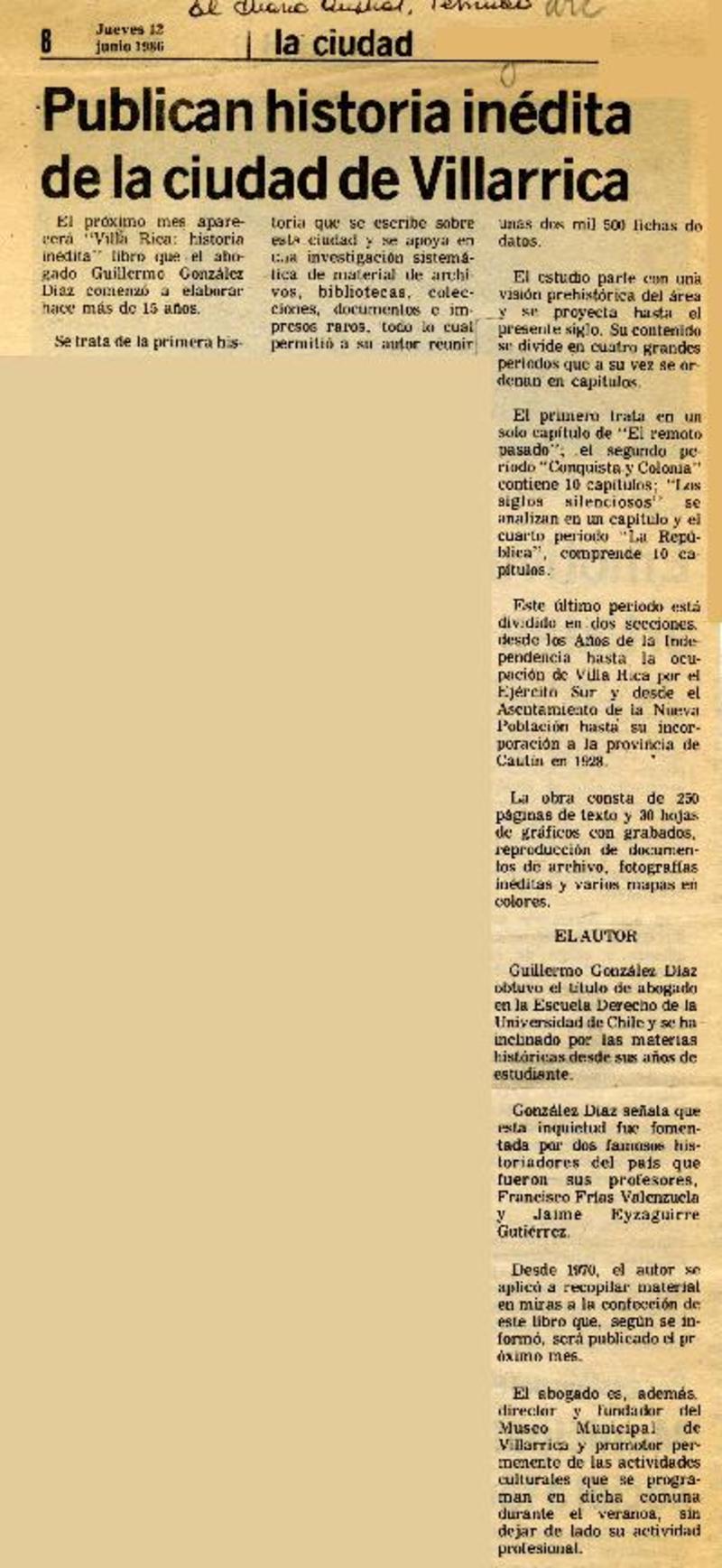Publican historia inédita de la ciudad de Villarrica [artículo].